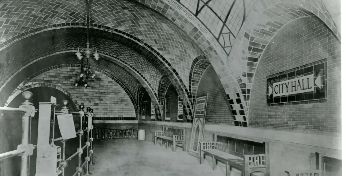 The Interborough Rapid Transit (IRT) subway, New York’s first underground rapid transit network, opened on October 27, 1904 with 28 stations along a 9.1-mile line. That four-track line began at City Hall, ran under Park Avenue South to Grand Central, across 42nd Street to Times Square, and up Broadway to 145th Street.